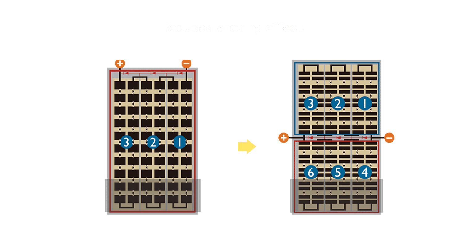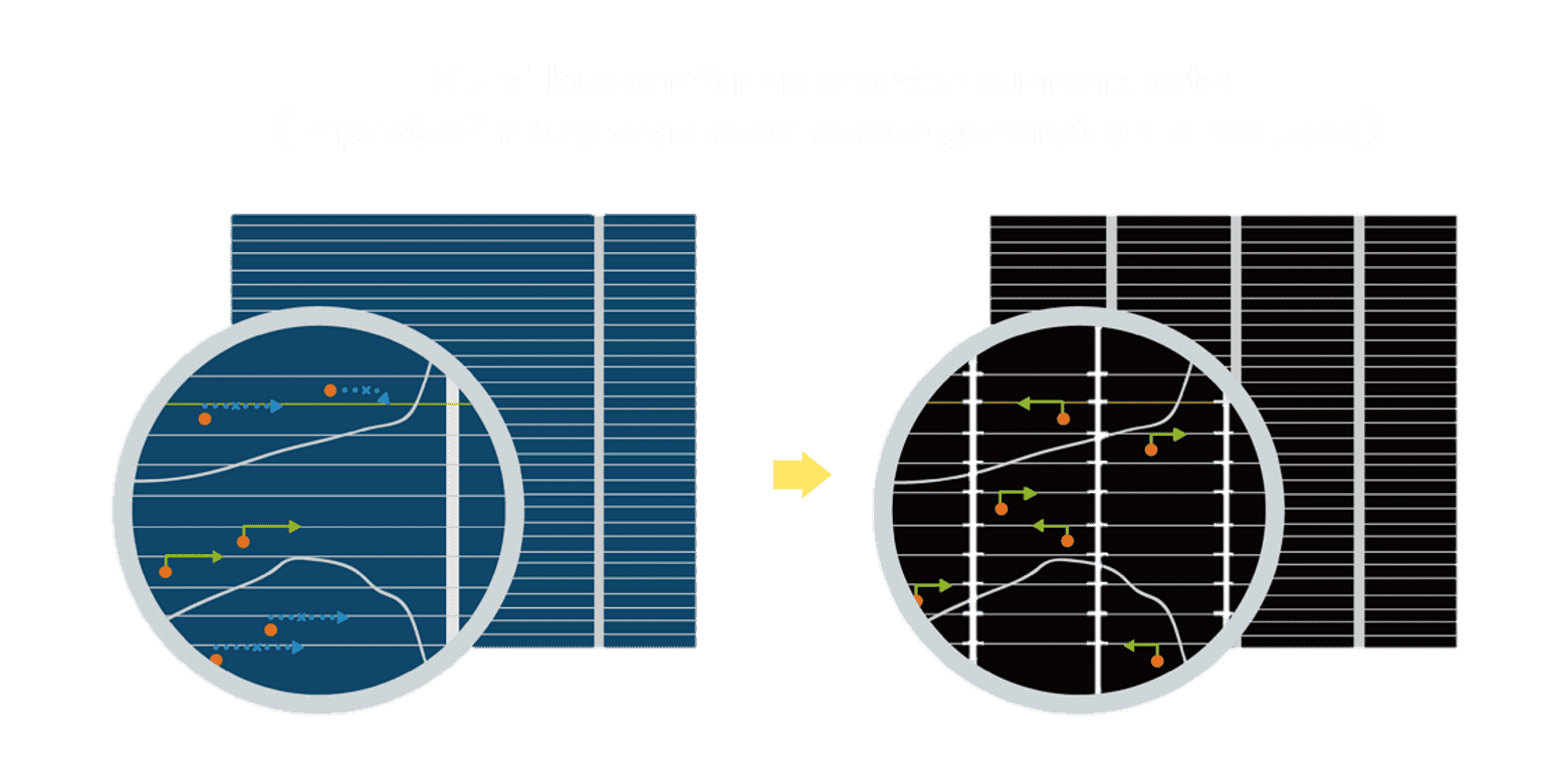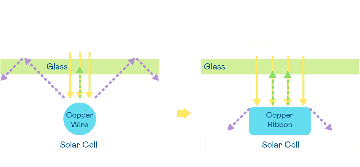 - 电池使用多条铜导线 (Copper wire) 于电池片上形成较短的电流路径,,,提高电流收集效率,,采用圆形设计的铜导线较传统扁平式的铜焊带 (Ribbon),,,可增加入射至电池的光线量。。